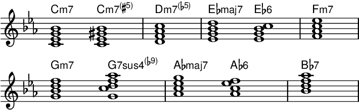 - トニック・マイナーのクリシェで使われる。G♯は本来異名同音のA♭で、慣用的に♯5(増5度)として表記される。