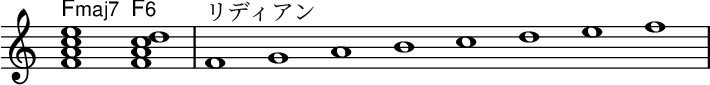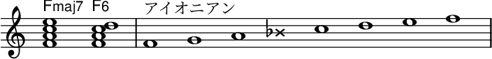 なお、メロディルート階名「ファ」)のとき、メロディと長7度のコード・トーンとの短2度または短9度の衝突を避けるため、IVmaj7 に代えて IV6 で演奏される。